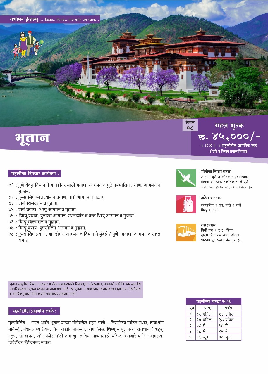 Departs from Mumbai/Pune by air. Arrives Baghdogra, transfer to Phuentsholing & Overnight stay.