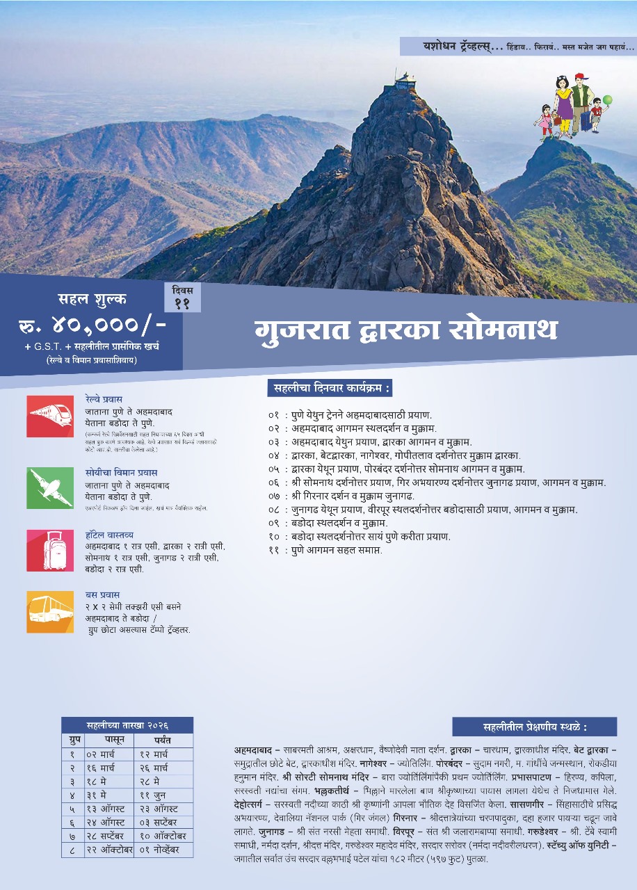 Ahmedabad – Sabarmati Ashram, Akshardham, Dwarka – Dwarkadheesh Mandir one of the sacred Dhams and Sharada peeth – one of the ‘Matths’ established by Adi Shankaracharya, Bet Dwaraka – residence of Lord Shri Krishna, Porbandar – Sudama city, Birth place of Mahatma Gandhi, Rokadiya Hanuman Temple. Sri Sorti Somnath Temple – Jyotirlinga Mandir – one of the most sacred Jyotirlings of Lord Shiva, Junagad – Samadi of Sant. Narsi Mehta, Girnagar – Foot Impression of Sri Dattatreya, Sasangir – Gir National Park – One of India’s oldest sanctuaries, and is synonymous with the majestic Asiatic lion. Prabhaspatan – Sangam of Hiranya-Kapila-Saraswati, Bhallaktirth – Important place as per Mahabharata, Dehotsarg Teerth– In the banks of River Saraswati the place where Srikrisha incremented his Body. Virpur – Samadi of Sant Jalaram Bappa, Dakornath – Srikrishna Temple, Garudeshwar– Tembe Swamy’s Temple, Sri Dutta Temple, Garudeshwar Mahadev Temple, Sardar Sarovar Dam, Statue of Unity – World’s tallest statue at 187 meters of Sardar Vallabhbhai Patel.