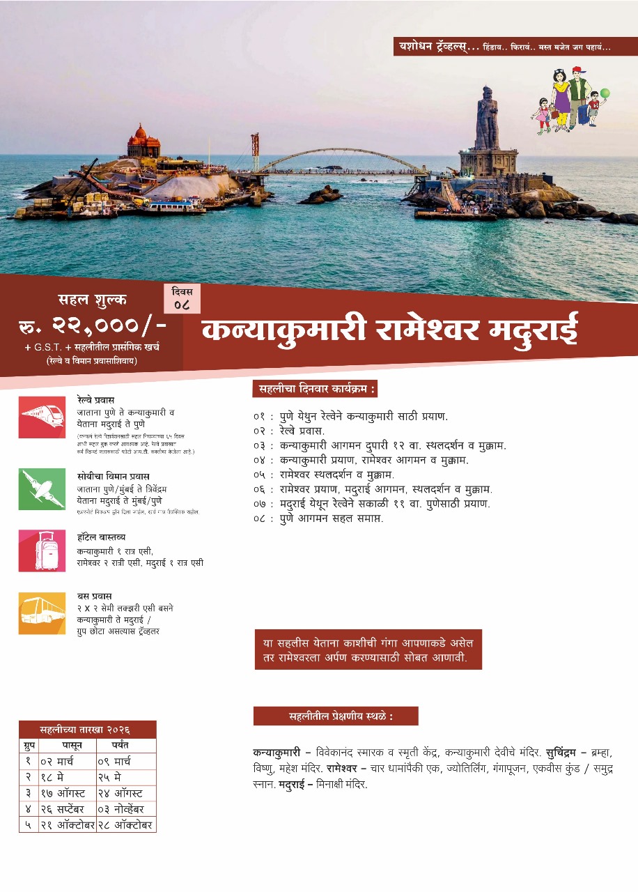 Kanyakumari – Vivekananda Rock Memorial, Gandhi Mandap, Kanyakumari Devi Temple. Suchindram-Brahma Vishnu Maheshwara temple. Madurai – Meenakshi Temple, Rameswaram – Rameswaram Temple which is one of the 12 Jyotirlinga shrines, Ganga poojan.