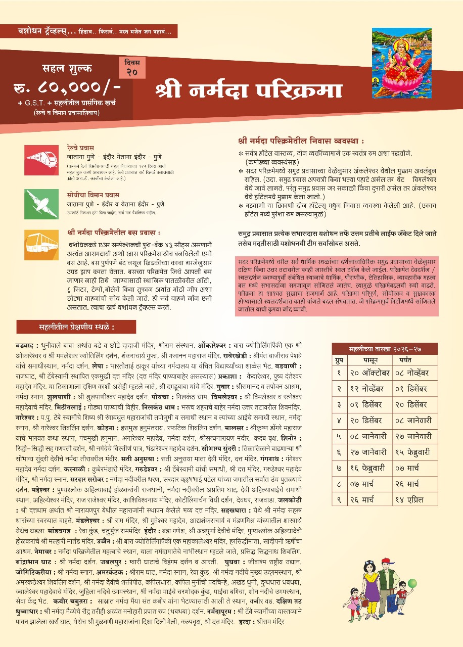 Barwaha– Temple of Dhuniwale baba, Sriram Maharaj Sansthan. Omkareshwar– one of the twelve Jyotirlingas & Sri Mamleshwar Jyotirling darshan, Sri Gajanan Maharaj Temple, Sukhdev Maharaj Temple, Shankaracharya Cave. Raverkhedi – Village where Sri Bajirao Peshwe spend his last time and died. Lepa: Narmadalaya School. Barwani– Raj Ghat, Single faced Dutta Temple. Prakasha– popularly known as Dakshin Kashi, Kedareshwar, Pushpa Danteshwar Temple, Shri Dagdu Baba Temple. Guwar– Sri Ramanand and Tapovan Ashram. Shoolpani– Temple of Shulpanishwar. Poicha: Nilkanthdham. Vimaleshwar– Shri Vimaleshwar & Ratneshwar Mahadev temple. Mithitalai– Sweet Water Pond. Poicha: Nilkanth Dham, Nareshwar– Samadhi of Sri Rangavdut Maharaj & there mother( Disciple of Sri Tembe Swami). Shri Nareshwar Shivling. Kohana– Hasmukh Hanumantrai and Crystal Shivling darshan. Malsar– Place where Bhagwat Katha of Sri Krishna Dongare Maharaj took place, Panchmukhi Hanuman, Angareshwar Mahadev, Sri Satyanarayan Temple, Kadambh Vruksha. Shinor– Ganesha with Riddhi Siddhi Temple. Soubhagya Sundari– Saubhagya Sundari Mata Mandir. Sati Anusaya– Sati Anusaya Mata Mandir, Datta Temple. Gangnath– Gangeshwar Mahadev, Narmada Bath. Karnali– Kuberbhandari Temple. Garudeshwar– Samadhi of Vasudevanand Saraswathi, Sri Dutta Mandir, Garudeshwar Mahadev Mandir. Sardar Sarovar– Dam built against Narmada River, Statue of Unity. Maheshwar– Capital of the great Maratha queen Rajmata Ahilya Devi Holkar, Rajwada, Dev Ghar, Ahilyaeshwar Temple, Raj Rajeshwar Temple, Kashi Vishwanath Temple, Kotilingarchan Vidhi darshan. Jalkoti– Sri Dutta Dham namely Sri Dutta Mandir built by Maharaj of Sri Narayanpur. Sahastradhara– River Narmada flows into Sahastradhara (thousand of springs). Mandleshwar– Sri Ram Temple, Mandavgad-Reva Kund, Chaturbhuj Ram Mandir, Nilkanteshwar Mahadev Temple. Indore-Bada Ganesha, Sri Annapurna Temple, Sri Malhari Marthand Temple of Sri Ahilyabai Holkar. Ujjain– Mahakaleshwar Temple(one of the 12 Jyotirling), Harsiddhi Mata temple, Sandhipani Rushi Ashram. Nemawar-Narmada Nabhisthan (mid point of holly Narmada from source point Amarkantak to Bay of Bengal), Famous Sidhnath Shivling. Bandrabhan Ghat– Sri Narmada Darshan. Jabalpur– Gwari Ghat. Ghughwa– Fossil Park. Jogi Tikariya– Bath at Holy Narmada. Amarkantak– Sri Ram Ghat, Rewa Kund, Origin place of Sri Narmada river, Sri Amarkanteshwar Shivling Temple, Narmada Devi Shaktipeeth, Kalyan Sewa Ashram, Kapildhara, Footprints of Kapil Muni, Akhand Dhuni, Dughadhara Waterfall, Jwaleshwar Mahadev temple, Origin of Juhila river, Narmada Maiyya Charnodak kund, Mai bagicha, Origin of Shon river, Sewa Kendra. Kabir Chabutara– Place where Saint Kabir achieved salvation, Kabir Vad– Banyan tree where Saint Kabir used to sit. Dakshin Tat Dhuhhadhar Fall– A huge cascade of water that falls from a height of 98 feet. Narmadapuram– Khara Ghat, Kalpavruksha, Sri Dutta Mandir. Harda– Shri Ram Mandir.
