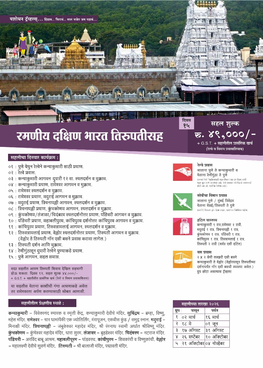 Kanyakumari – Vivekananda Rock Memorial, Gandhi Mandap, Kanyakumari Devi Temple, Suchindram – Brahma Vishnu Mahesh temple Rameshwaram – Rameshwaram Temple which is one of the 12 Jyotirlinga shrines, Ganga poojan, 21 Kund. Madurai – Meenakshi Temple, Tiruchirappalli – Jambukeshwar Mahadev Temple, Shri Vishnu Temple, Kumbhakonam – Shiv Temple, Navgrah Temple, Tanjavur – Bhrudeshwar Temple, Chidambaram – Natraj Temple, Pondicherry – Arvind Babu Ashram, Mahabalipuram – Pandav Rath, Kanchipuram – Shiv Kanchi and Vishnu Kanchi, Vellore – Golden temple of Mahalaxmi, Tirupati – Balaji Temple, Padmavati Temple.